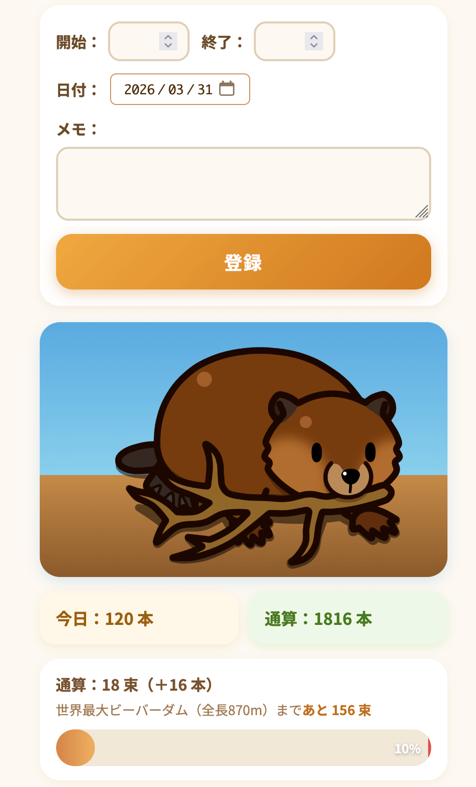 ビーバーモチーフの作業記録アプリを作りました(自分用)